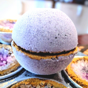 My Geode bath bomb is rock-style globe made with activated charcoal and filled with white and purple crystals.